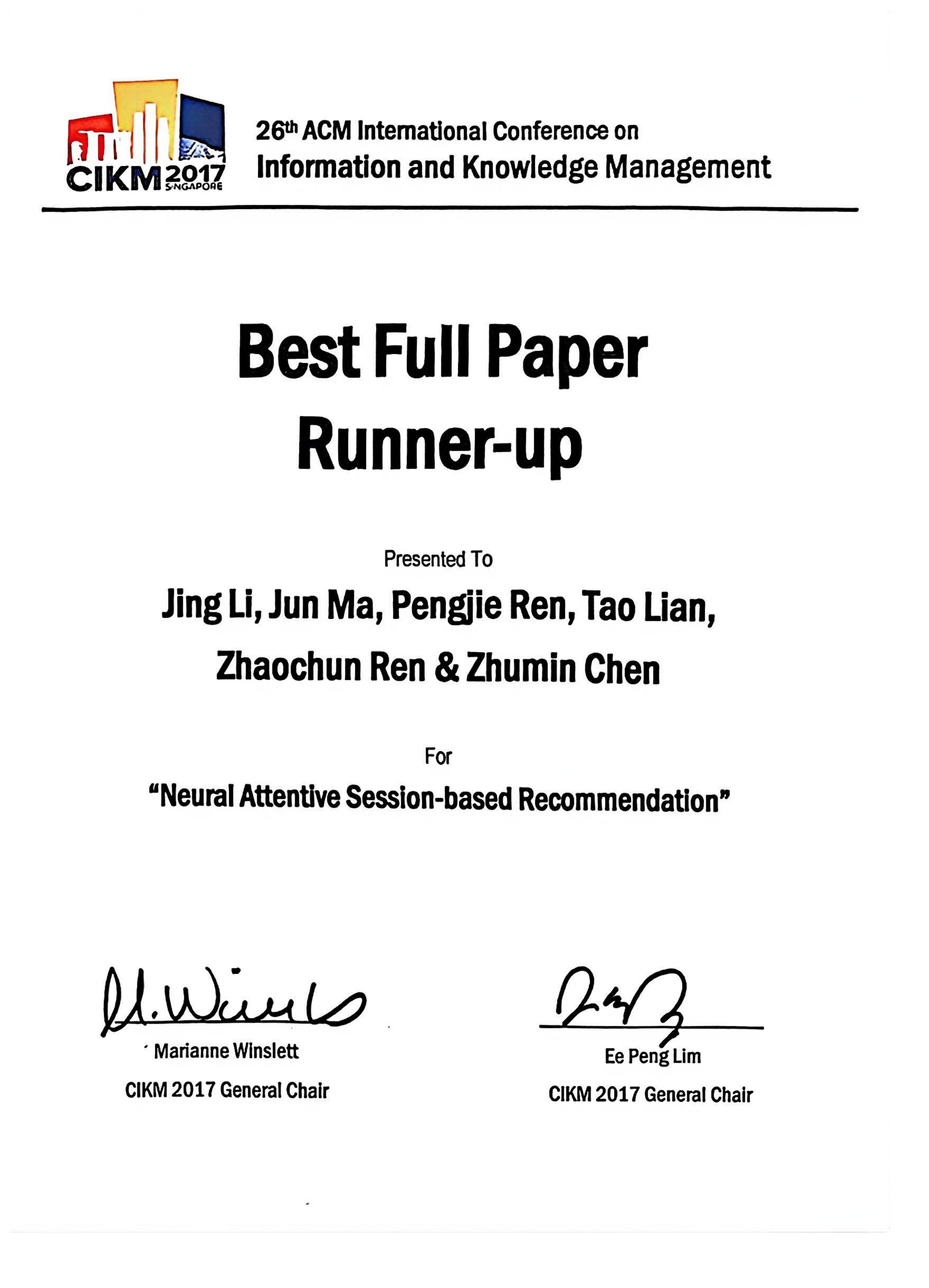 Jing Li, Pengjie Ren, Zhumin Chen, Zhaochun Ren, Tao Lian and Jun Ma. Neural Attentive Session-based Recommendation. The 26th ACM International Conference on Information and Knowledge Management (CIKM), 2017.